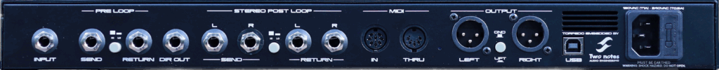 Pre Two Notes (mono) & Post Two Notes (stereo) FX Loops. Both selectable between Line and Instrument level. Plugging into the return of the Pre Loop gives you direct access to the Two Notes back end, for use with other preamp devices, or re-amping etc. The stereo post loop allows you to fully preserve the stereo output from the Torpedo Embedded, adding in your stereo post effects prior to the XLR outs